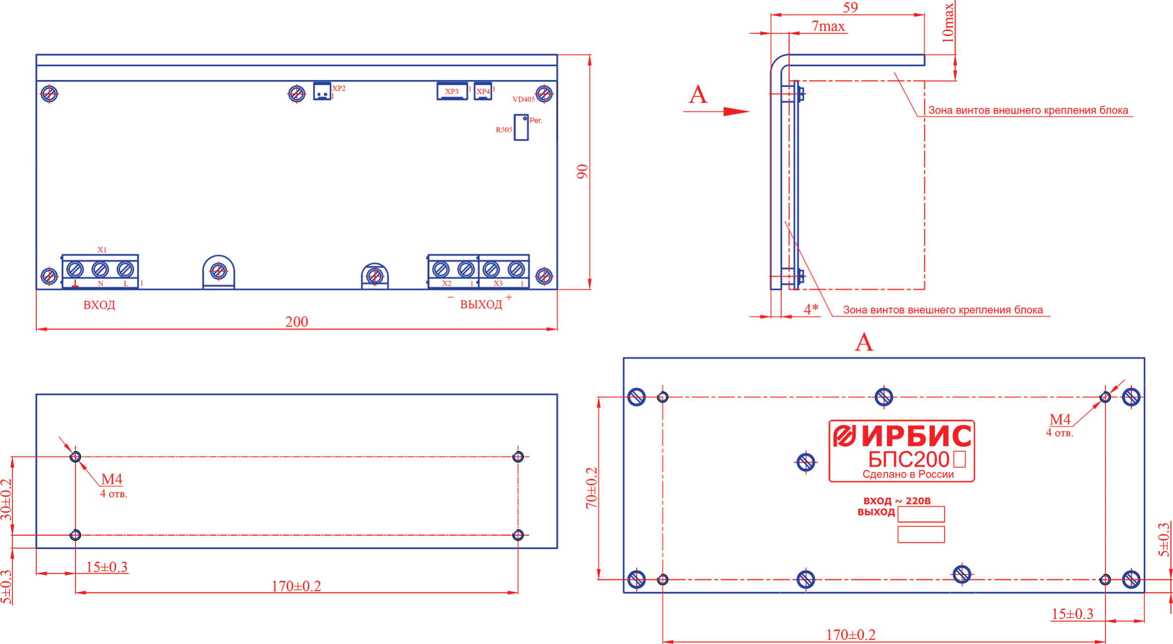 Одноканальные стабилизирующие блоки питания БПС200 предназначены для питания напряжением постоянного тока радиоэлектронной аппаратуры. Выпускаются в двух конструктивных исполнениях: открытая плата, закрепленная на радиаторе, блок в корпусе. Масса блока БПС200 – 900 г., БПС200_к – 1000 г. Диапазон рабочих температур от 0°С до +40°С на радиаторе. Типовой КПД 86…90%. Нестабильность выходного напряжения при изменении напряжения питания от 175 В до 264 В не более ±0,5%. Нестабильность выходного напряжения при изменении тока нагрузки от х.х. до Iн.макс не более 1%. Амплитуда пульсации выходного напряжения не более 100 мВ. Модуль имеет защиту от короткого замыкания по выходу. После снятия короткого замыкания модуль автоматически восстанавливает свои выходные параметры. Электрическая прочность изоляции между входными и выходными контактами 1500 В (действующее значение). Срок службы 15 лет.