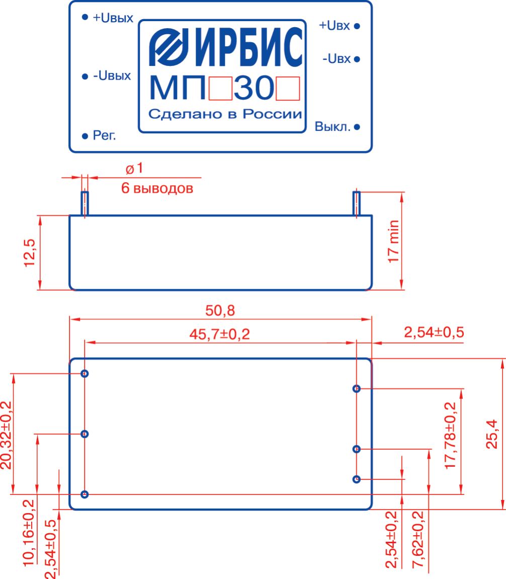 Металлический корпус, залитый компаундом. Масса модуля 40 г. Диапазон рабочих температур от –40°С до +85°С на корпусе. КПД 89 … 92%. Амплитуда пульсации выходного напряжения 150 мВ. Нестабильность выходного напряжения при изменении входного напряжения от минимального до максимального не более 1%. Нестабильность выходного напряжения при изменении тока нагрузки в пределах от 0,1 Iн.макс до Iн.макс не более ±0,5%. Модуль имеет дистанционное выключение, регулировку выходного напряжения ±5%, защиту от перегрузки по току и к. з. по выходу с автоматическим возвратом. Ток срабатывания защиты – (1,05 … 1,5) Iн. макс. Время к. з. не ограничено. с Электрическая прочность изоляции 500 В постоянного напряжения. Коэффициент температурной нестабильности выходного напряжения в диапазоне температур от –40°С до +85 °С на корпусе не более ±0,02 %/°С. Расчетное время наработки между отказами 600 000 ч.