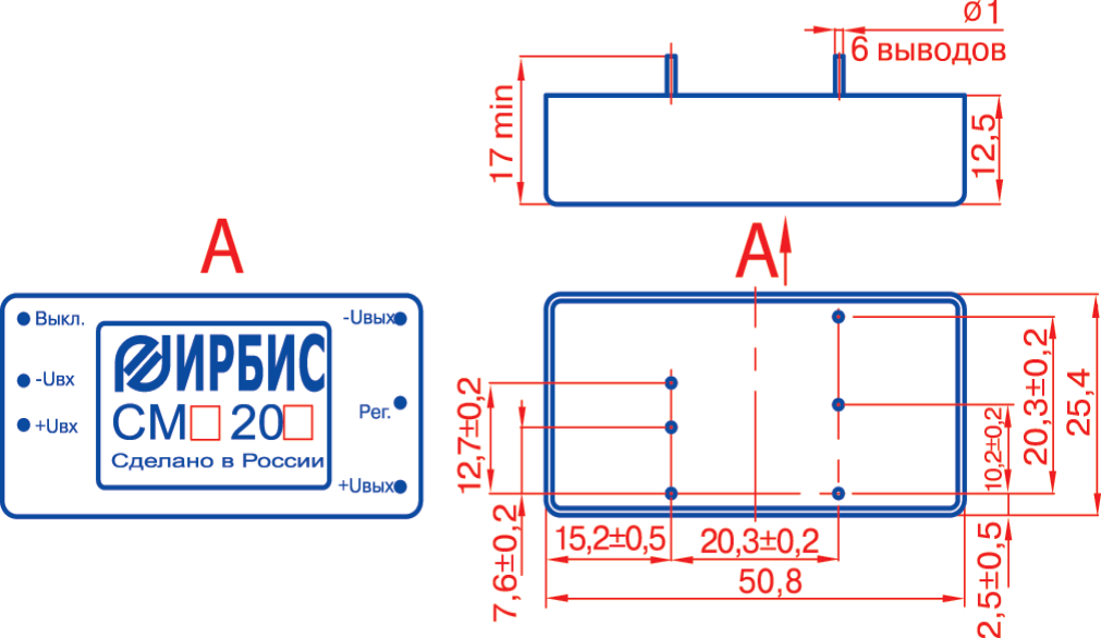 Металлический корпус, залитый компаундом. Масса 35 г. Диапазон рабочих температур от –40°С окружающей среды до +85°С на корпусе. Типовой КПД 86 … 90%. Амплитуда пульсации выходного напряжения (от пика до пика) 150 мВ. Нестабильность выходного напряжения при изменении входного не более ±0,5%. Нестабильность выходного напряжения при изменении тока нагрузки не более 0,5%, для модулей СМА (В, Е, Т)20-3,3 не более 1%. Модуль имеет защиту от перегрузки по току и к. з. по выходу. После снятия перегрузки или к. з. модуль автоматически восстанавливает свои выходные параметры. Время к. з. не ограничено. Дистанционное выключение, регулировка выходного напряжения в пределах не менее ±5%. Коэффициент температурной нестабильности выходного напряжения не более ±0,02%/°С. Электрическая прочность изоляции между входными и выходными контактами 500 В постоянного напряжения. Большая допустимая емкость нагрузки. Расчетное время наработки между отказами 600 000 ч