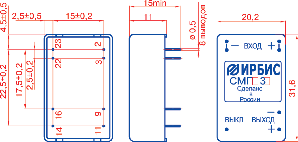 Модуль питания стабилизирующий с одним выходным каналом. Предназначен для питания напряжением постоянного тока радиоэлектронной аппаратуры. Конструктивно выполнен в металлическом корпусе, залитый компаундом. Масса 15 г. Диапазон рабочих температур от –40С окружающей среды до +85С. Назначение выводов соответствует зарубежным стандартам. Типовой КПД 75…84%. Изменение выходного напряжения при изменении нагрузки от 10 до 100% – 1%. Коэффициент нестабильности выходного напряжения от изменения температуры – 0,01%/С. Амплитуда пульсаций выходного напряжения (от пика до пика) менее 120 мВ. Модуль имеет защиту от перегрузки и короткого замыкания по выходу. Возможно дистанционное выключение модуля. После снятия перегрузки или к. з. модуль автоматически восстанавливает свои выходные параметры. Время к. з. не ограничено. Электрическая прочность изоляции между входными и выходными контактами 500 В постоянного напряжения. Расчетное время наработки между отказами 1 000 000 ч.