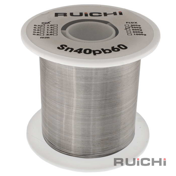 Припой RUICHI Sn40/Pb60, диаметр 2.0 мм, 100 г — оловянно-свинцовый легкоплавкий припой, производится в виде проволоки различного диаметра. Используется в качестве присадочного материала для закрепления методом пайки нескольких металлических элементов из разных металлов.